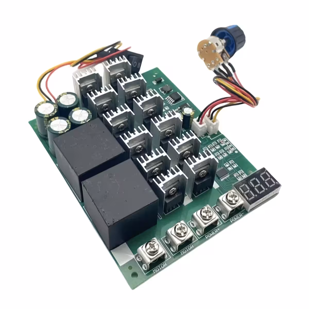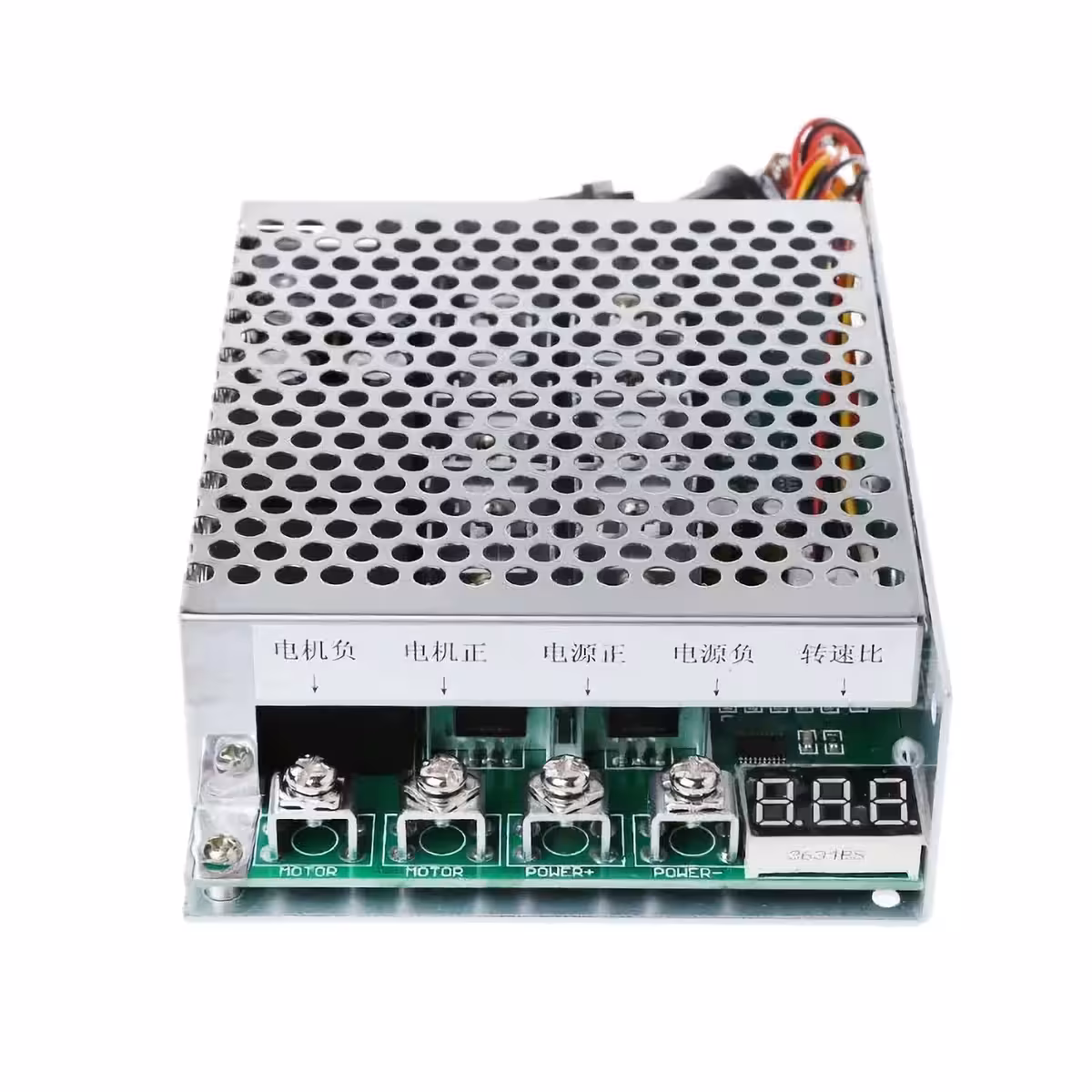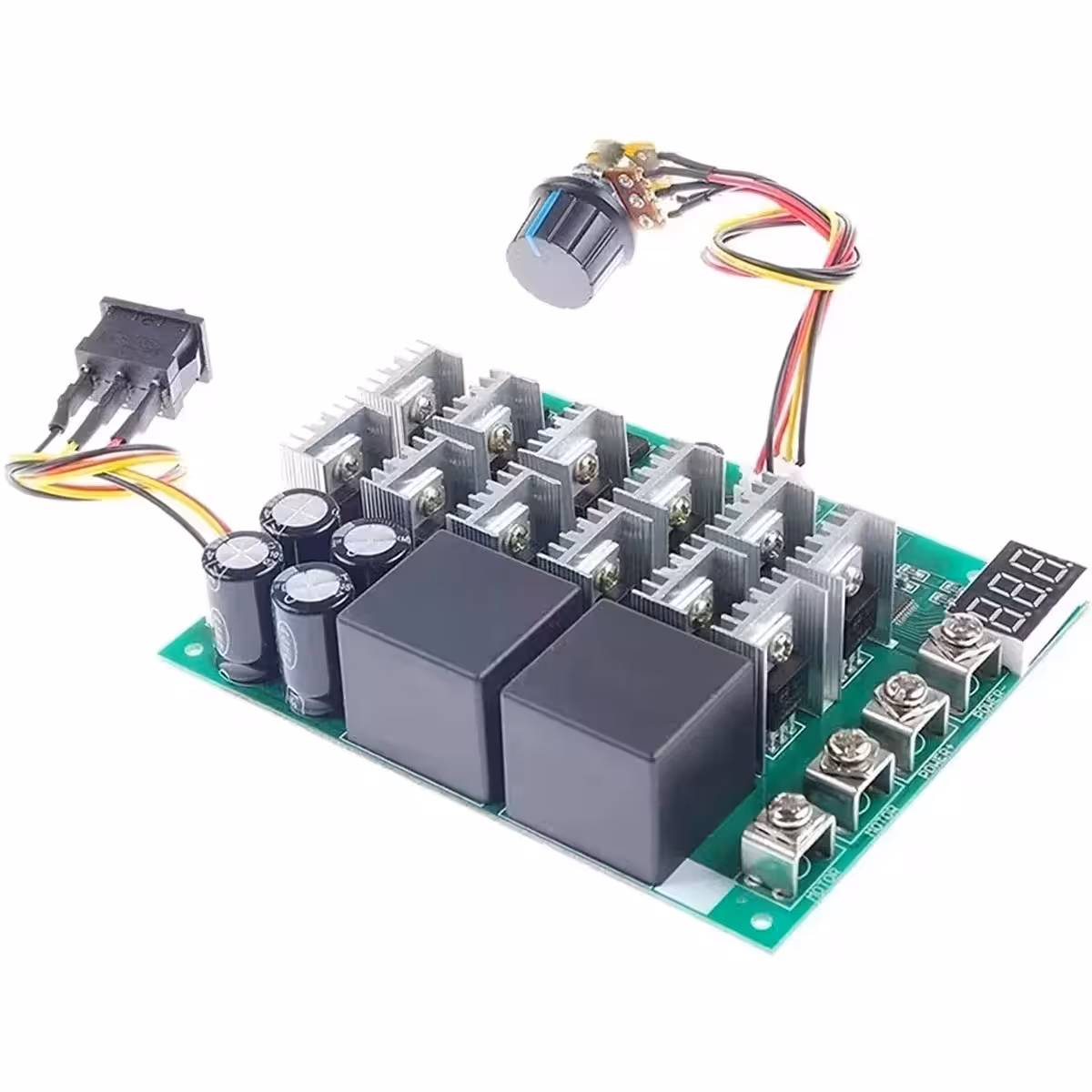 Contrôleur PWM professionnel pour le contrôle de la vitesse des moteurs électriques en courant continu (DC), idéal pour les applications haute puissance. Offre un réglage précis de la vitesse via potentiomètre, fonction d’inversion du sens de rotation et affichage digital de la vitesse (0–100%). Compatible avec tensions d’entrée entre 10V et 55V et courants jusqu’à 100A (60A en continu).