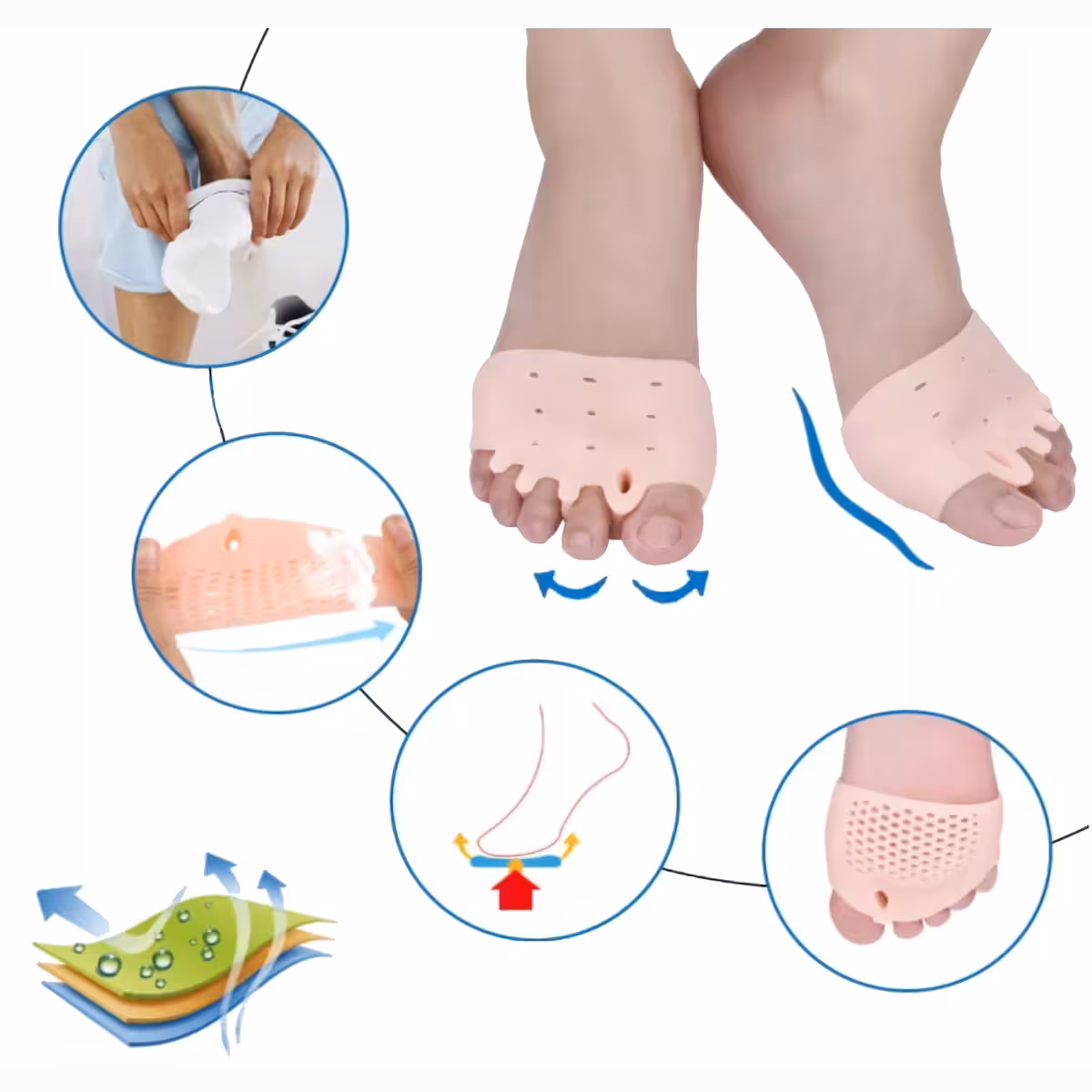 - Contrôle le mouvement anormal du pied et réduit le risque de formation d’oignons