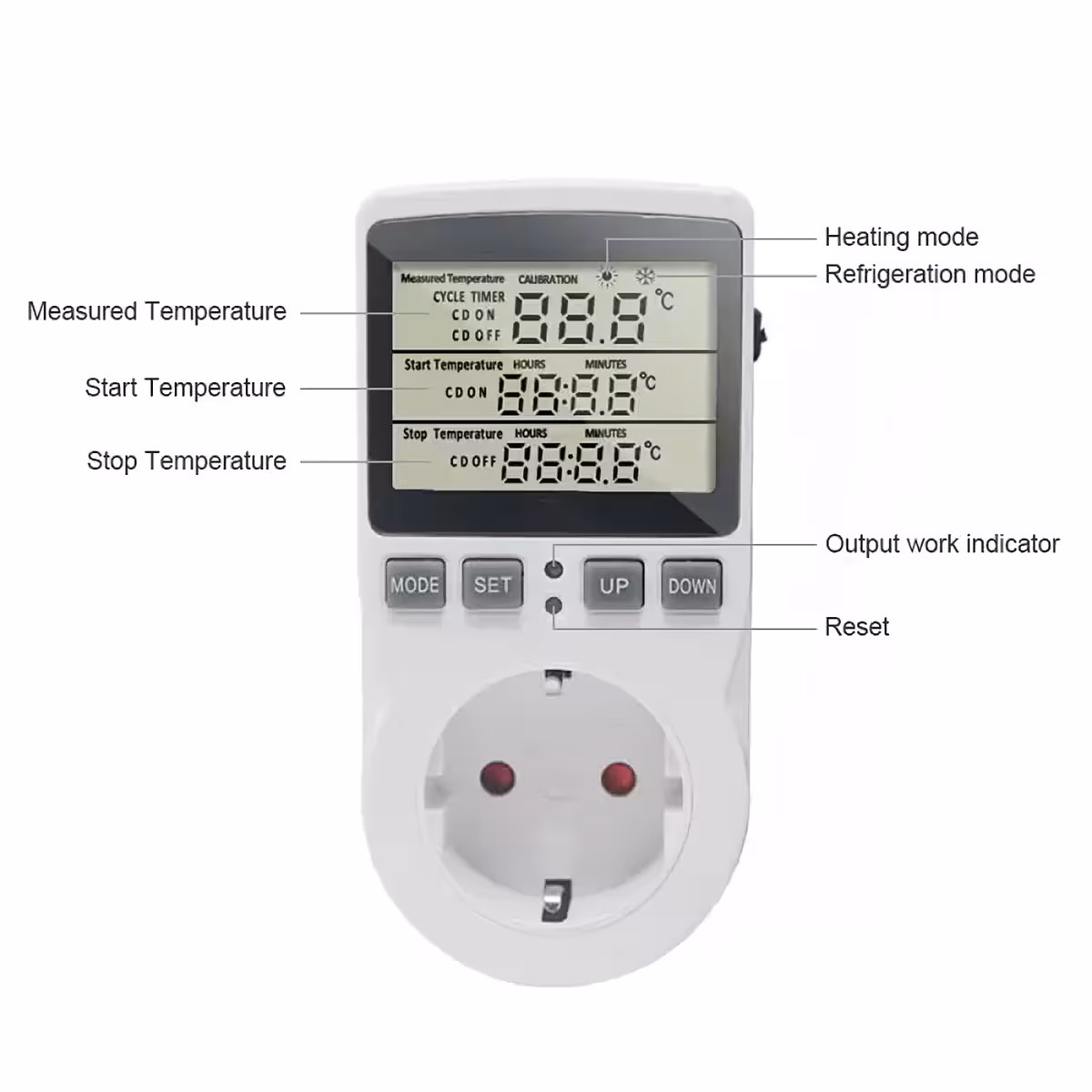 Prise avec thermostat numérique contrôlable, idéale pour une gestion précise de la température dans les logements et les espaces commerciaux. Compatible avec les radiateurs électriques, panneaux thermiques, climatiseurs, ventilateurs, serres, aquariums et autres équipements nécessitant un contrôle automatique de la température.