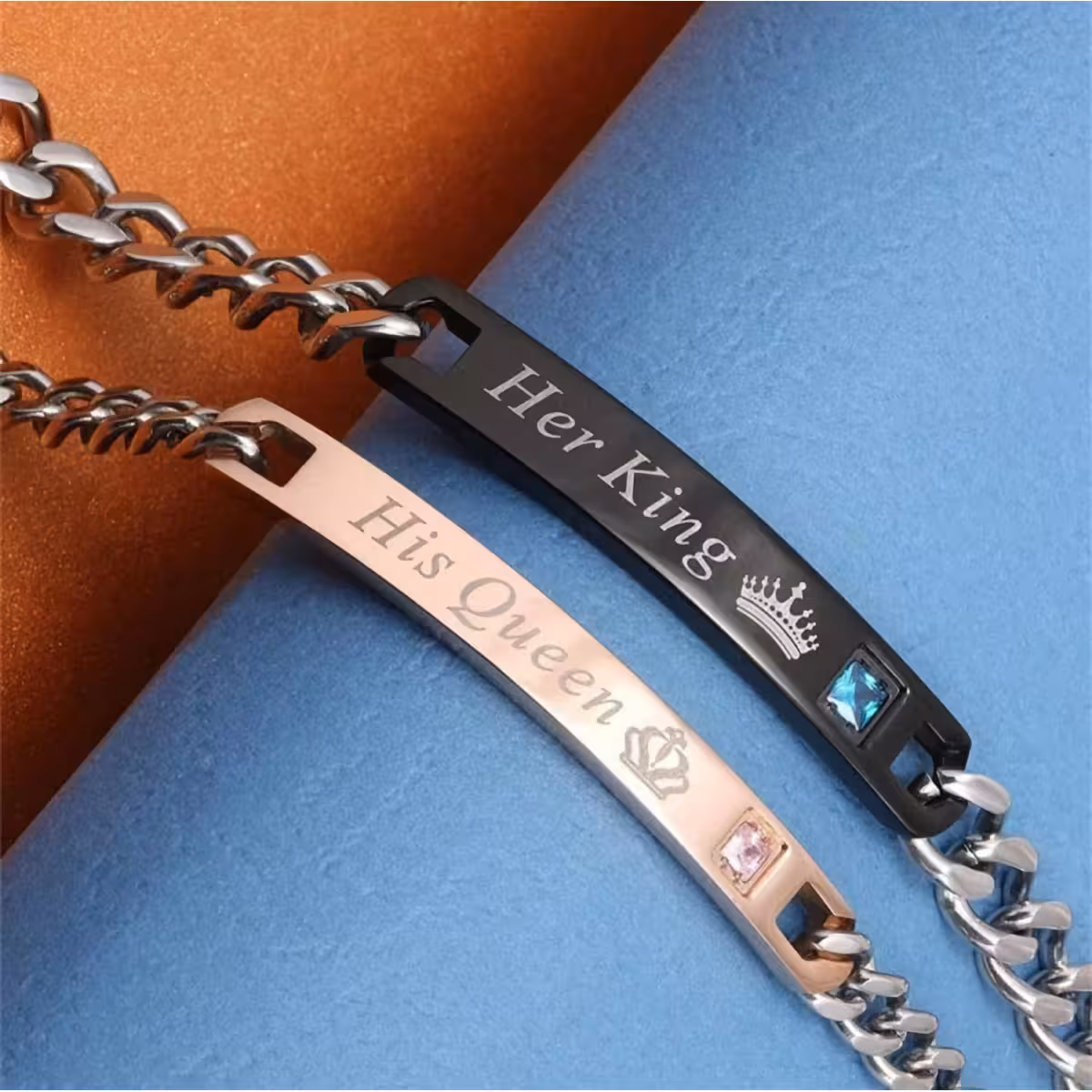 Set de 2 Bracelets pour Couple – Her King & His Queen, Gravure Laser, Acier Inoxydable