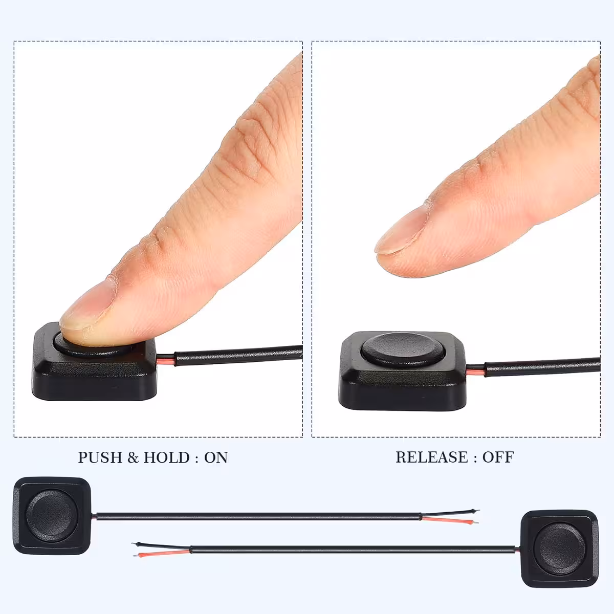 Set de 2 pièces de boutons mini pour 12V / 24V, conçus pour un montage apparent dans des applications auto, moto, marine, équipements industriels et projets électroniques. Les boutons sont pré-câblés (2 broches : rouge = « + », noir = « – »). La fonction sans maintien les rend actifs uniquement lorsqu’ils sont pressés, idéaux pour des commandes à faible consommation et une signalisation rapide.