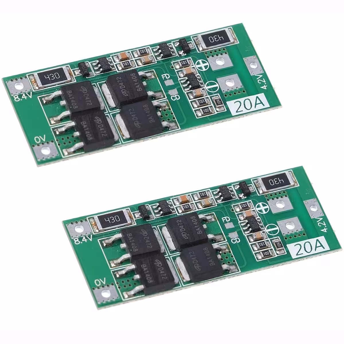 Lot composé de 2 cartes BMS 2S 20A (7,4V nominal / 8,4V plein) avec fonction d’équilibrage, conçues pour la protection et la gestion des packs Li-Ion (y compris 18650 et 26650). Offre une protection complète : surcharge, sous-tension, surintensité, court-circuit et réinitialisation automatique. Dimensions compactes, idéales pour les projets DIY et équipements portables.